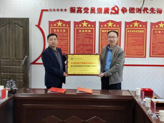 在会双方领导经过充分的研讨交流后,签订共建实践中心框架协议,李宜兵代表学校向毛坝镇授非遗茶旅产教融合实践中心授牌,并给谭轲、郭方强、廖建军、王淳颁发了专家聘请证书。