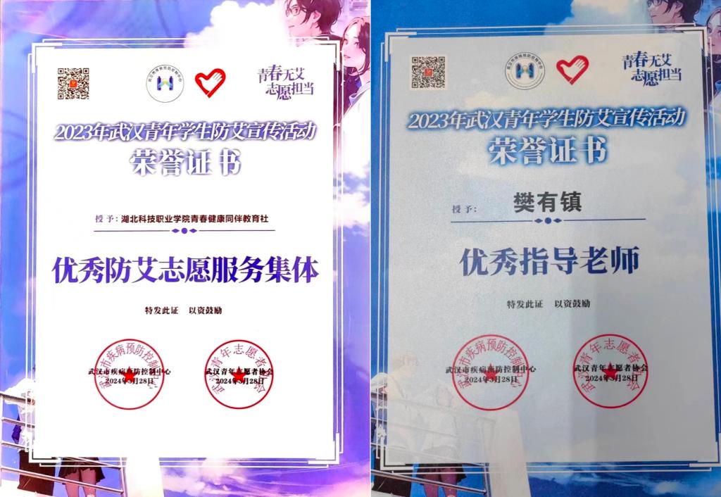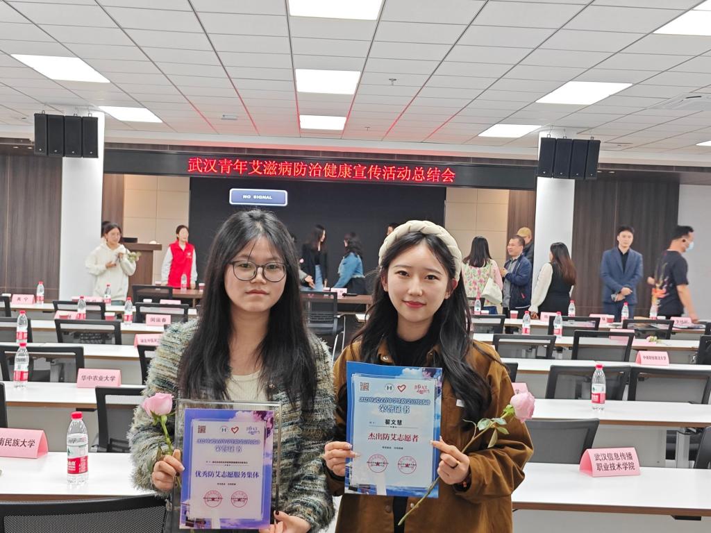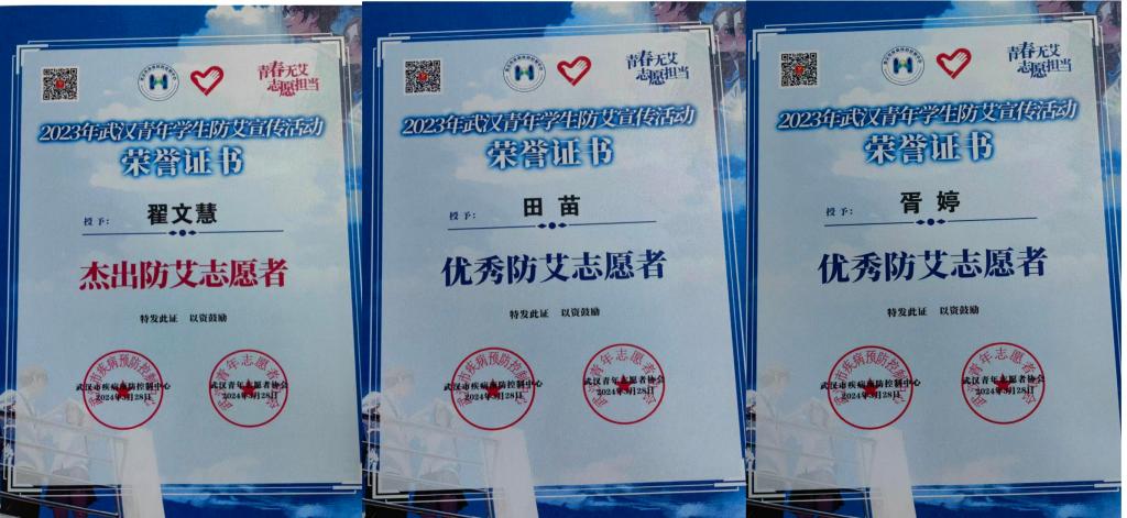 本网讯(通讯员 樊有镇 翟文慧 文/图)3月28日下午,武汉市疾病预防控制中心、武汉青年志愿者协会在武汉人力资源服务产业园召开了2023年武汉青年学生防艾宣传活动总结会,对活动中涌现出的先进集体、先进个人进行通报表扬。我校青春健康同伴教育社获评武汉市“优秀防艾志愿服务集体”,工商管理学院青协指导老师樊有镇获评武汉市“校园行活动优秀指导老师”,工商管理学院青年志愿者协会会长翟文慧获评武汉市“杰出防艾志愿者”,学院青年志愿者协会会长胥婷和田苗共获评武汉市“优秀防艾志愿者”。