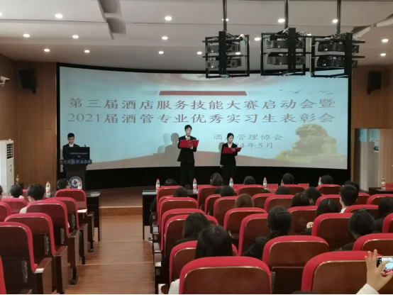 本网讯(通讯员 杨国丽/文 鲍翠/图)为参加省赛酒店服务赛项选拔种子选手,推动邮轮旅游专业群课岗赛证融合发展,弘扬劳动光荣、技能宝贵、创造伟大的时代风尚,5月16日,工商管理学院举办了第三届酒店服务技能大赛启动会暨2021届酒管专业优秀实习生表彰会。