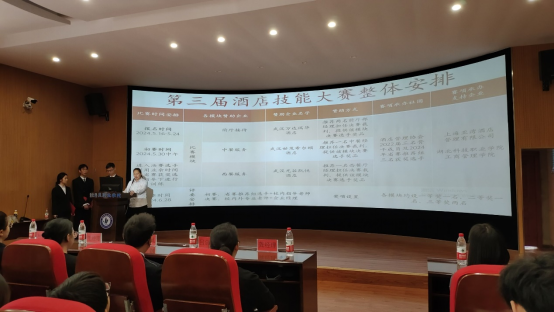 活动由学院管理与数字化运营专业和国际邮轮乘务管理专业教学团队联合指导酒店管理协会开展。武汉世茂希尔顿酒店人力资源部总监吕斌、武汉光谷凯悦酒店人力资源部经理王思佳、武汉万达瑞华酒店人力资源部经理龚丽及房务培训经理艾映出席本次活动,三家企业将分别对院赛的中餐、西餐和前厅三个模块给予技术指导、裁判支持和赞助选手奖品。上海亚湾酒店管理有限公司为推进教育部供需对接项目,将以赛课融通为主题的横向课题经费作为本次比赛提供耗材和兄弟院校执裁的费用支持。工商管理学院党总支吕恒喜代表学院致辞,感谢合作企业对本次院赛的大力支持,希望通过以校企联办技能大赛为契机做出更多产教融合成果。