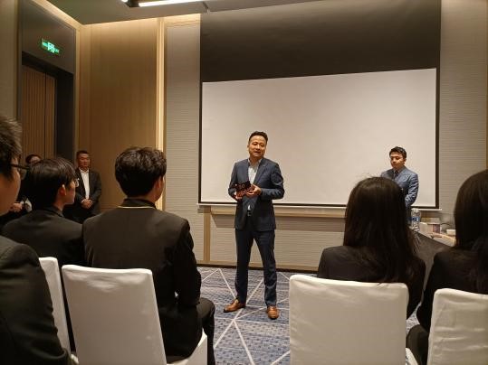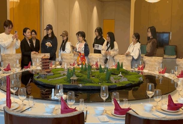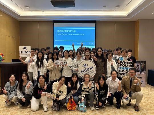 在武汉世茂希尔顿酒店,学生们首先在宴会厅聆听了培训经理关于希尔顿品牌文化及酒店经营特色的介绍。随后,学生们分组参观了酒店的行政酒廊、大堂吧、中餐厅、西餐厅、健身中心等运营区域,以增进对五星级酒店各部门运作的理解。茶歇之后,酒店资深经理人力资源部总监吕斌、前厅部副经理于洋、客房部行政副管家程宝明等,分别向学生们分享了高星级酒店行业的职业发展经历,并指导他们如何制定合理的职业规划。