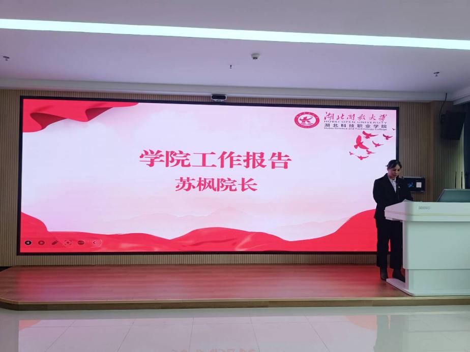 会上,院长苏枫作了学院工作报告。报告梳理了2024年学院取得的61项国家级(全国性)和省级(全省性)标志性成果,全面总结了党的建设、教育教学、学生工作、招生就业方面取得的成绩,肯定了全体教职工为学院发展作出的努力,从职业教育政策演进、职业教育与开放教育融合发展、学校改革发展走向三个层面分析了新阶段学院发展面临的机遇和挑战,并提出了学院“十五五”四项核心发展目标和2025年十项重点工作思路,鼓励全体成员铆足干劲、再创辉煌。