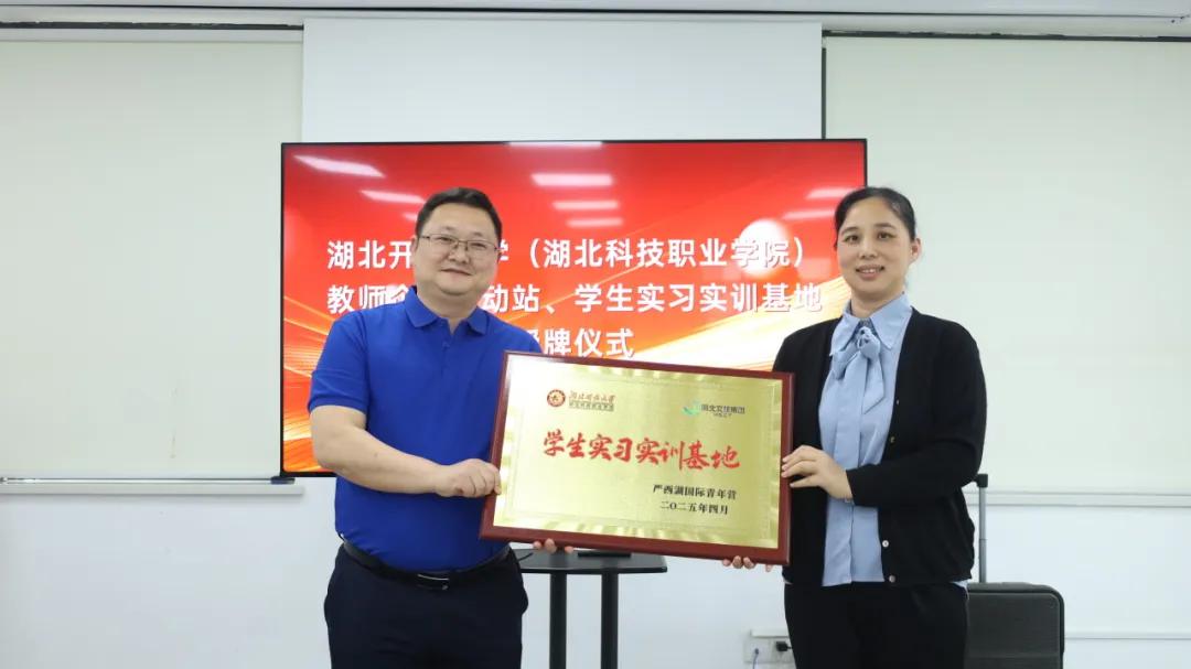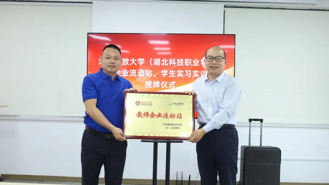 湖北省旅游集团长江文化旅游传播中心总经理、湖北中旅集团总经理汪洋接受湖北开放大学(湖北科技职业学院)工商管理学院院长苏枫授牌