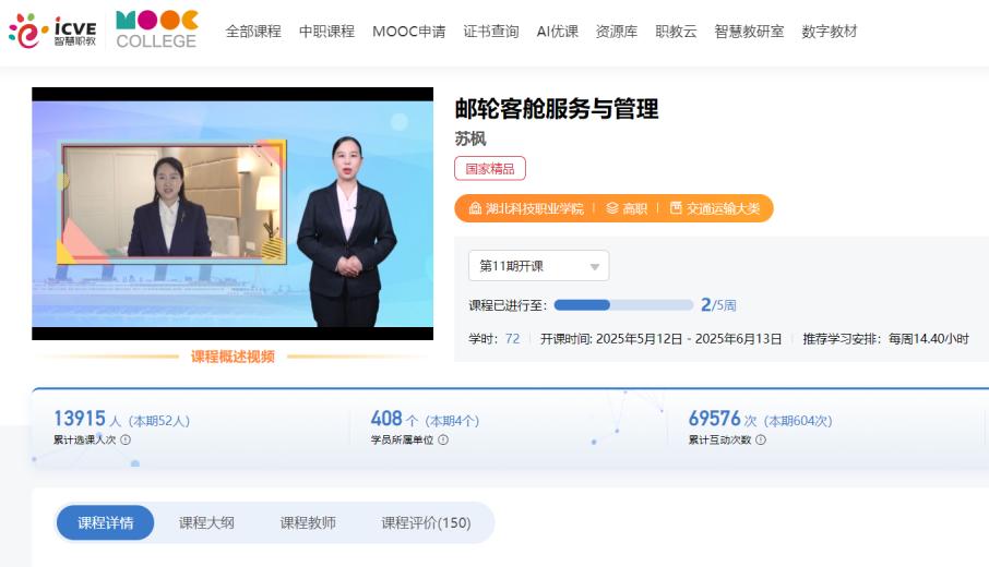 本网讯(通讯员 詹乐 文/图)近日,教育部召开国家教育数字化战略行动2025年部署会,正式发布国家智慧教育平台2.0智能版,并在“双千”计划专题页上线了系列专业课程群和职业能力培训课程,我院院长苏枫教授主持的《邮轮客舱服务与管理》课程成功入选。这一成绩的取得,充分彰显了学院紧跟学校和国家教育数字化战略,在课程建设方面取得显著成效,为学生未来职业发展奠定坚实的基础。