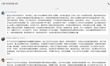 活动第五项,交流学习心得。会后,学生党员在QQ群分享了学习心得,他们表示通过本次主题党日的学习,将个人梦想与国家的发展紧密相连,牢记历史使命,积极承担社会责任。