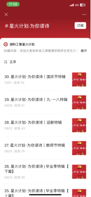 1.“典耀中华”为你读诗诵读活动:传承经典,共庆佳节。学院通过“星火计划”微信公众号“为你读诗”主题栏目,鼓励同学们诵读经典诗篇散文、书籍选段等内容,共发布了8期专题特辑。这些特辑包括毕业季特辑、教师节特辑、迎新特辑、国庆节特辑等。每个特辑都精心挑选了与之相关的经典作品,让同学们在诵读中感受节日的氛围,同时也加深了对传统文化的理解。