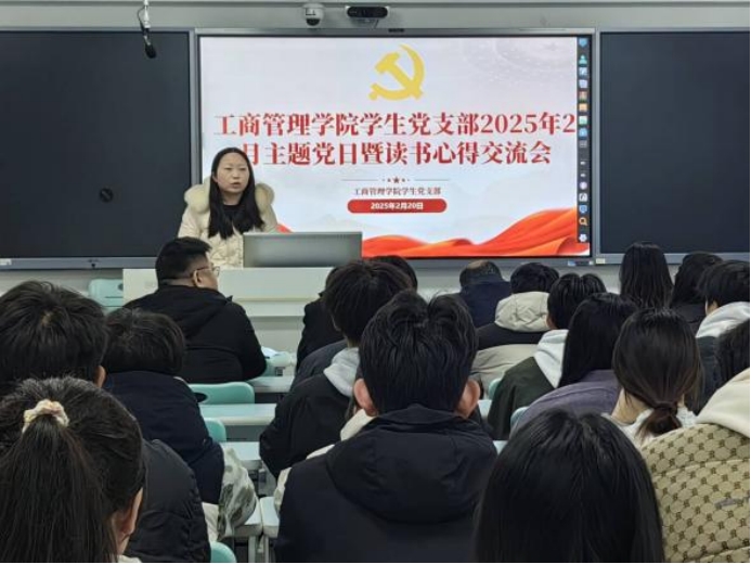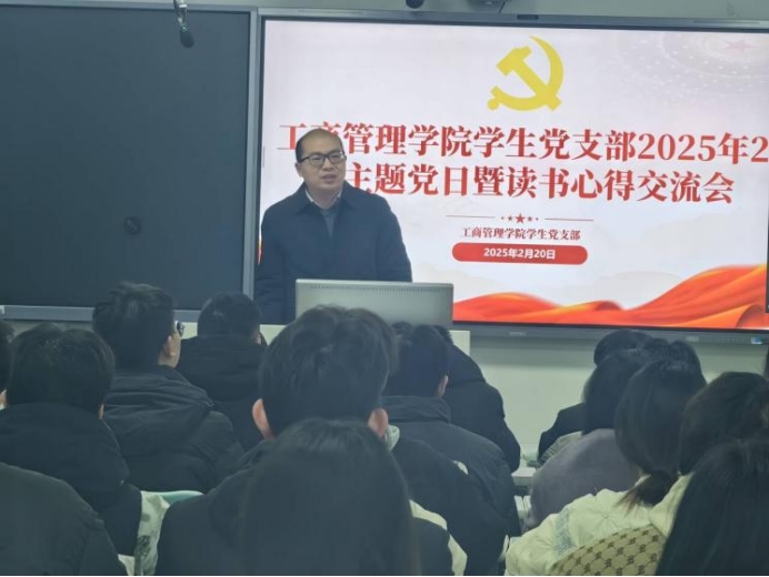 本网讯(通讯员 徐尹冉 文/图))2025年2月20日下午,工商管理学院学生党支部在6302智慧教室召开2月主题党日活动暨寒假读书心得分享会。本次活动由寿老师主持,学院党总支书记熊振、全体辅导员和2022级中共预备党员、2023级入党积极分子参加本次会议。