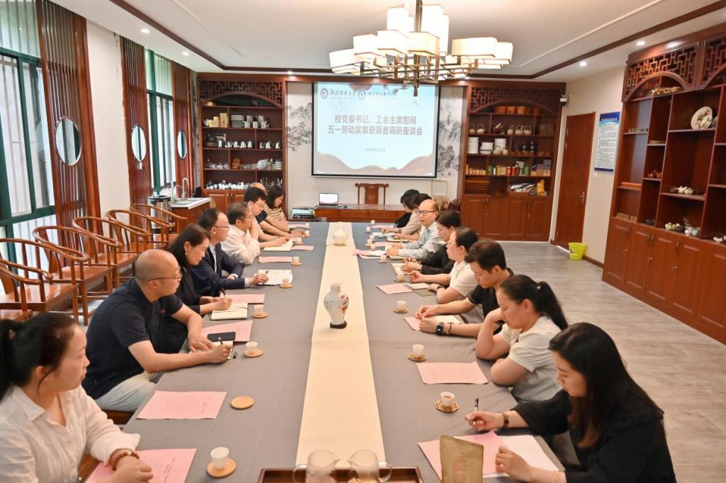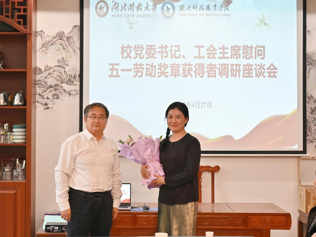 本网讯(通讯员 李缜/文 刘捷/图)4月27日上午,在“五一”国际劳动节到来之际,校党委书记钟毓宁,党委常委、工会主席李宜兵代表学校党委看望慰问“武汉五一劳动奖章”获得者——工商管理学院陈蔚老师,并同工商管理学院班子成员、教师代表进行调研座谈。党办校办、宣传部、工会、人事处等部门主要负责人陪同参加活动。