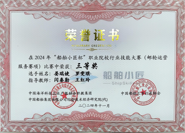 2024届邮轮学子罗翊菘就职于深圳迅隆船务有限公司负责的大湾区二号旅游观光船,职位是技术保障,薪资8500元以上。
