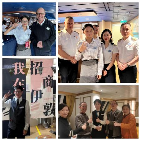 2023届邮轮学子阮启胜(左三)曾就职于武汉扬子江游船有限公司“总统6号”,现就职于我国首艘国产大型邮轮“爱达•魔都号”邮轮,薪资1350美金以上。