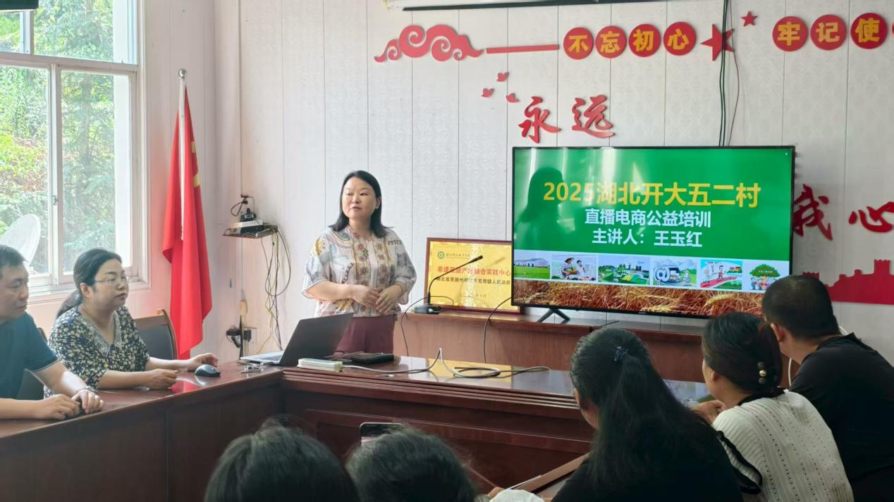 本网讯(通讯员 邓红 / 文 王玉红 / 图)为响应国家乡村振兴战略号召,践行培育既懂农业又懂数字化 “新农人” 的使命担当,7 月 30 日,湖北开放大学(湖北科技职业学院)工商管理学院网络营销与直播电商专业负责人邓红、王玉红老师,奔赴恩施州利川市五二村开展暑期 “AI 赋能直播电商” 公益培训实践活动。教师团队深入乡村一线,聚焦村民实际需求,凭借专业技能优势为乡村振兴注入数字动能,为五二村村民打开了通往数字经济新时代的大门。